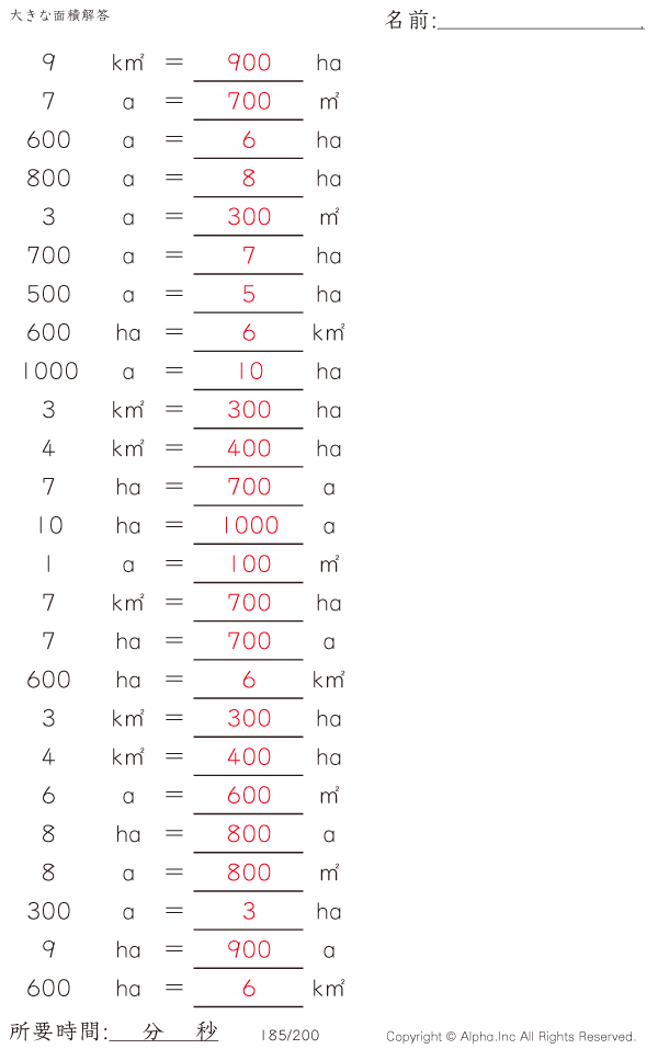 上記のボタンから「大きな面積・アール・ヘクタール」の算数数学ドリル・計算ドリル(PDFプリント)がダウンロードできます。個人利用は無料です(家庭以外での配布は有料です)。