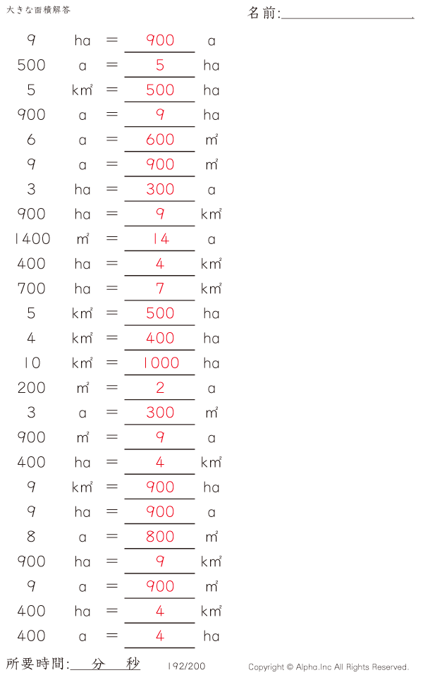 上記のボタンから「大きな面積・アール・ヘクタール」の算数数学ドリル・計算ドリル(PDFプリント)がダウンロードできます。個人利用は無料です(家庭以外での配布は有料です)。