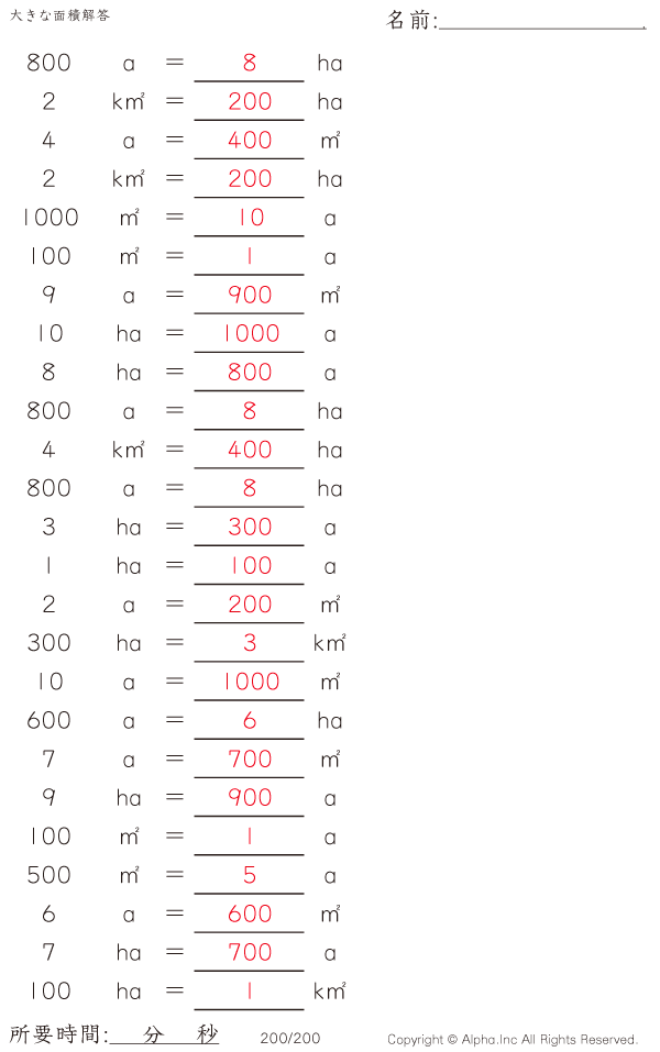 上記のボタンから「大きな面積・アール・ヘクタール」の算数数学ドリル・計算ドリル(PDFプリント)がダウンロードできます。個人利用は無料です(家庭以外での配布は有料です)。