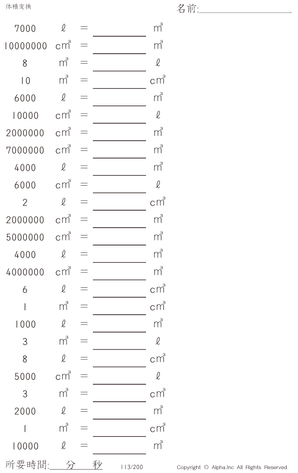 上記のボタンから「体積変換」の算数数学ドリル・計算ドリル(PDFプリント)がダウンロードできます。個人利用は無料です(家庭以外での配布は有料です)。