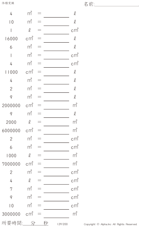 上記のボタンから「体積変換」の算数数学ドリル・計算ドリル(PDFプリント)がダウンロードできます。個人利用は無料です(家庭以外での配布は有料です)。