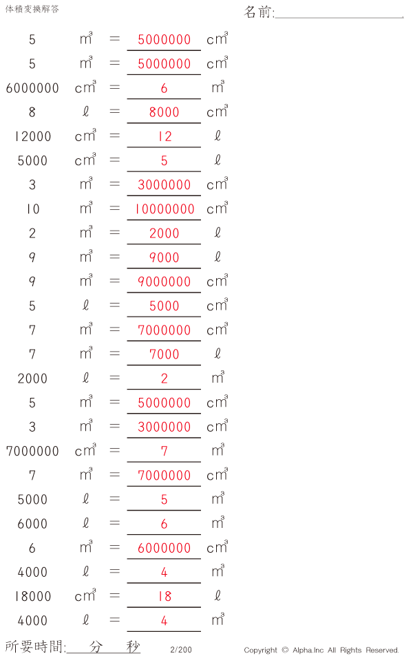 上記のボタンから「体積変換」の算数数学ドリル・計算ドリル(PDFプリント)がダウンロードできます。個人利用は無料です(家庭以外での配布は有料です)。