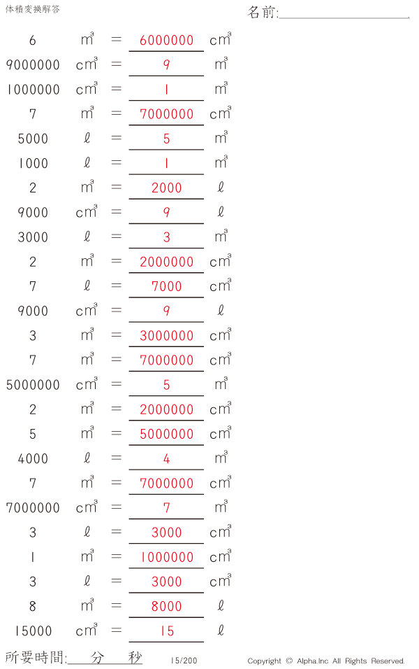 上記のボタンから「体積変換」の算数数学ドリル・計算ドリル(PDFプリント)がダウンロードできます。個人利用は無料です(家庭以外での配布は有料です)。
