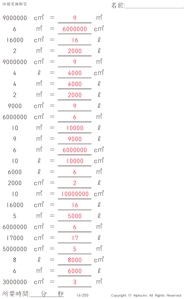 上記のボタンから「体積変換」の算数数学ドリル・計算ドリル(PDFプリント)がダウンロードできます。個人利用は無料です(家庭以外での配布は有料です)。