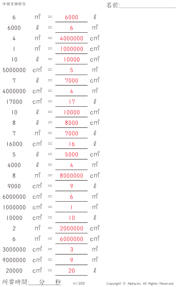 上記のボタンから「体積変換」の算数数学ドリル・計算ドリル(PDFプリント)がダウンロードできます。個人利用は無料です(家庭以外での配布は有料です)。