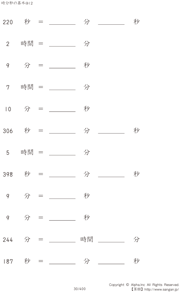 上記のボタンから「時分秒の基本@12」の算数数学ドリル・計算ドリル(PDFプリント)がダウンロードできます。個人利用は無料です(家庭以外での配布は有料です)。