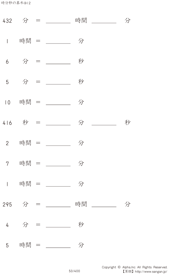 上記のボタンから「時分秒の基本@12」の算数数学ドリル・計算ドリル(PDFプリント)がダウンロードできます。個人利用は無料です(家庭以外での配布は有料です)。