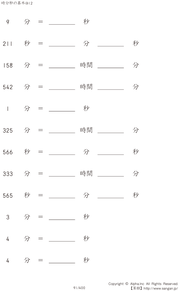 上記のボタンから「時分秒の基本@12」の算数数学ドリル・計算ドリル(PDFプリント)がダウンロードできます。個人利用は無料です(家庭以外での配布は有料です)。