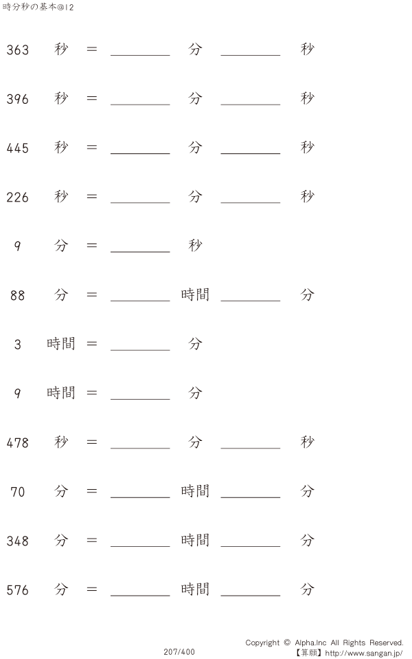 上記のボタンから「時分秒の基本@12」の算数数学ドリル・計算ドリル(PDFプリント)がダウンロードできます。個人利用は無料です(家庭以外での配布は有料です)。