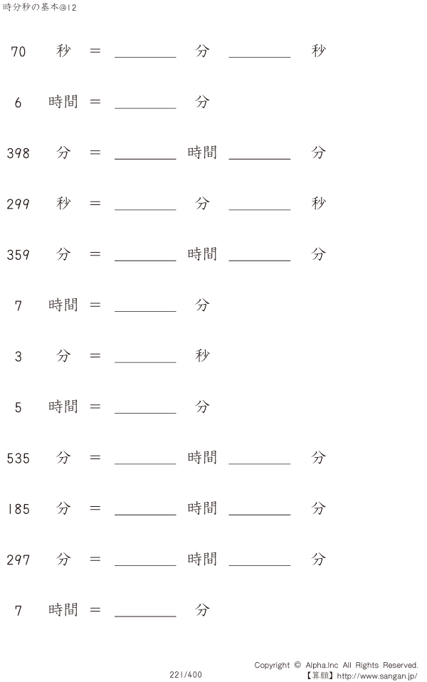 上記のボタンから「時分秒の基本@12」の算数数学ドリル・計算ドリル(PDFプリント)がダウンロードできます。個人利用は無料です(家庭以外での配布は有料です)。