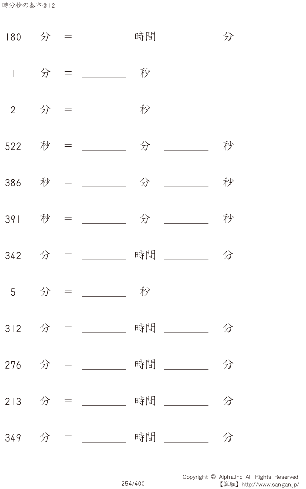 上記のボタンから「時分秒の基本@12」の算数数学ドリル・計算ドリル(PDFプリント)がダウンロードできます。個人利用は無料です(家庭以外での配布は有料です)。