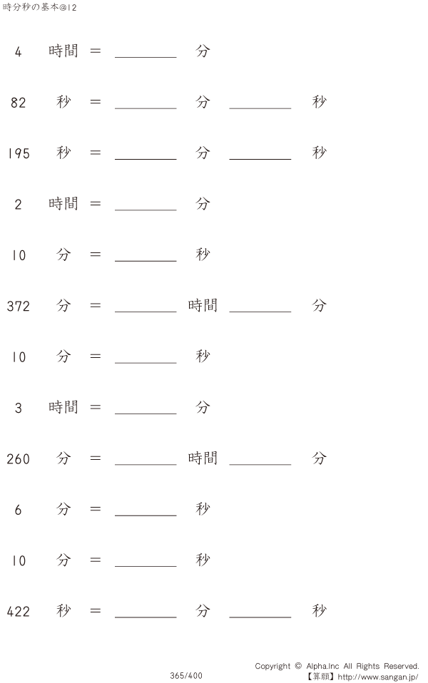 上記のボタンから「時分秒の基本@12」の算数数学ドリル・計算ドリル(PDFプリント)がダウンロードできます。個人利用は無料です(家庭以外での配布は有料です)。
