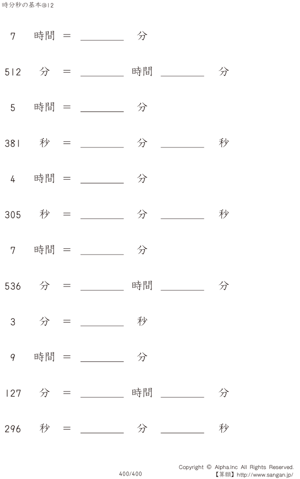 上記のボタンから「時分秒の基本@12」の算数数学ドリル・計算ドリル(PDFプリント)がダウンロードできます。個人利用は無料です(家庭以外での配布は有料です)。