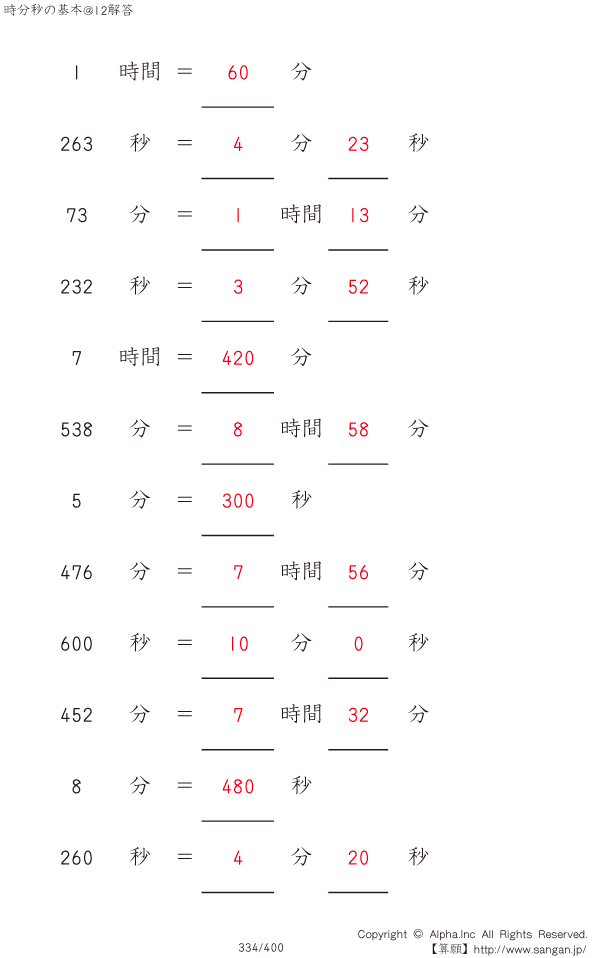 上記のボタンから「時分秒の基本@12」の算数数学ドリル・計算ドリル(PDFプリント)がダウンロードできます。個人利用は無料です(家庭以外での配布は有料です)。