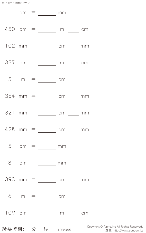 上記のボタンから「m・cm・mm@12」の算数数学ドリル・計算ドリル(PDFプリント)がダウンロードできます。個人利用は無料です(家庭以外での配布は有料です)。