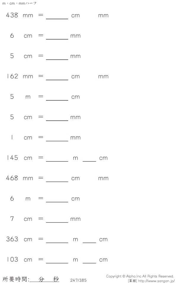 上記のボタンから「m・cm・mm@12」の算数数学ドリル・計算ドリル(PDFプリント)がダウンロードできます。個人利用は無料です(家庭以外での配布は有料です)。