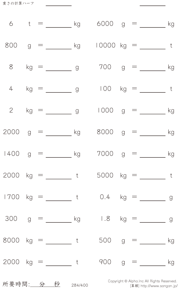上記のボタンから「グラム・キロ・トン@24」の算数数学ドリル・計算ドリル(PDFプリント)がダウンロードできます。個人利用は無料です(家庭以外での配布は有料です)。