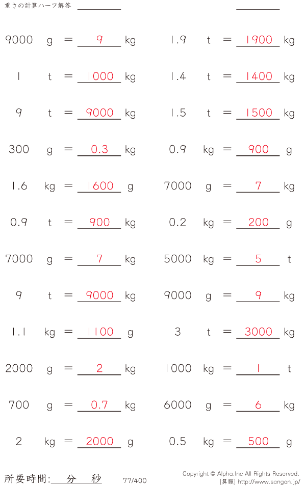 上記のボタンから「グラム・キロ・トン@24」の算数数学ドリル・計算ドリル(PDFプリント)がダウンロードできます。個人利用は無料です(家庭以外での配布は有料です)。