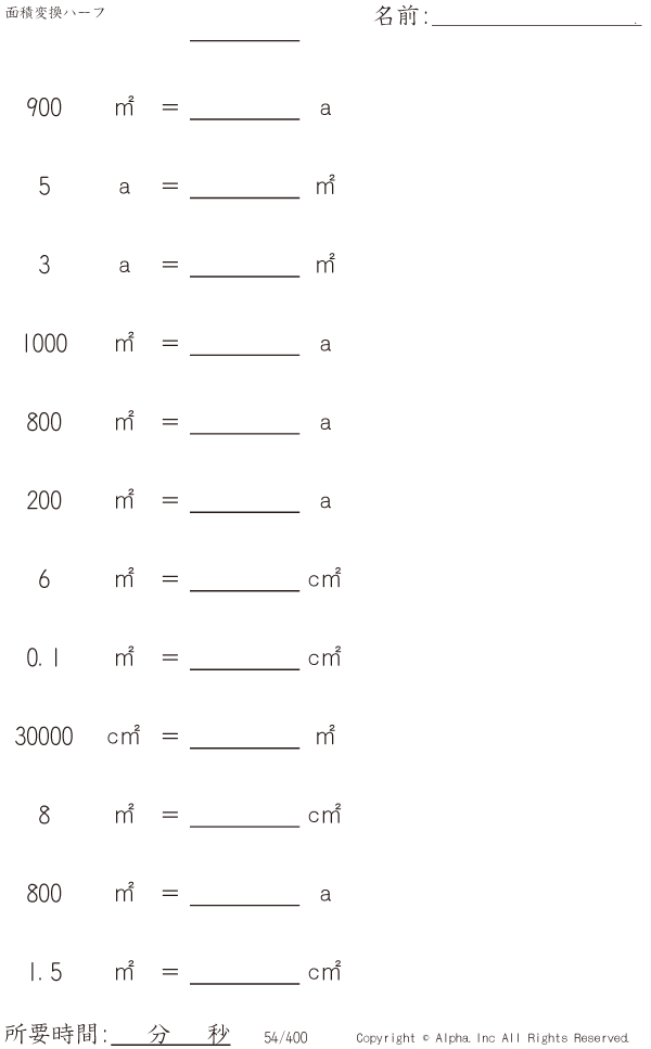 上記のボタンから「面積変換@12」の算数数学ドリル・計算ドリル(PDFプリント)がダウンロードできます。個人利用は無料です(家庭以外での配布は有料です)。
