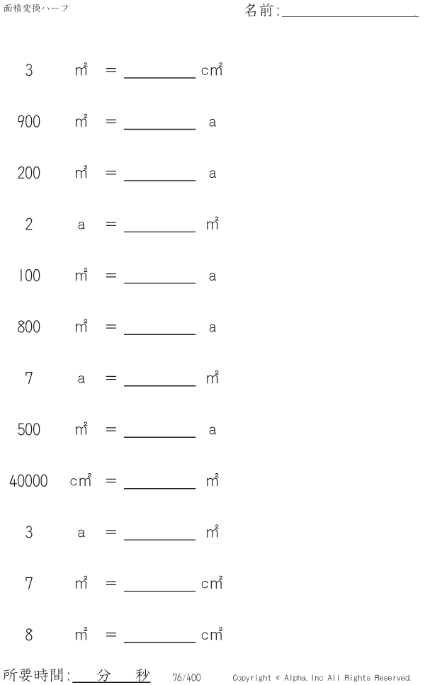 上記のボタンから「面積変換@12」の算数数学ドリル・計算ドリル(PDFプリント)がダウンロードできます。個人利用は無料です(家庭以外での配布は有料です)。