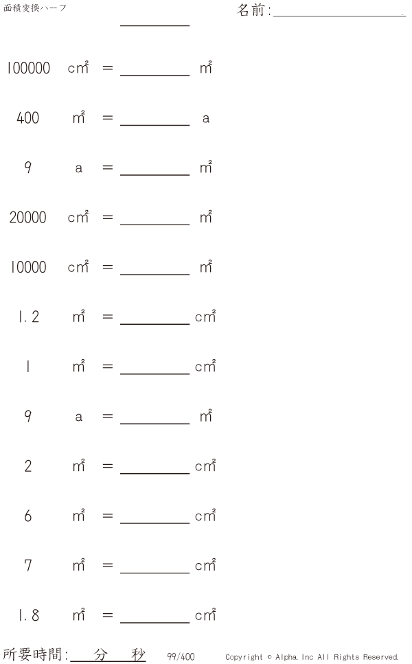 上記のボタンから「面積変換@12」の算数数学ドリル・計算ドリル(PDFプリント)がダウンロードできます。個人利用は無料です(家庭以外での配布は有料です)。