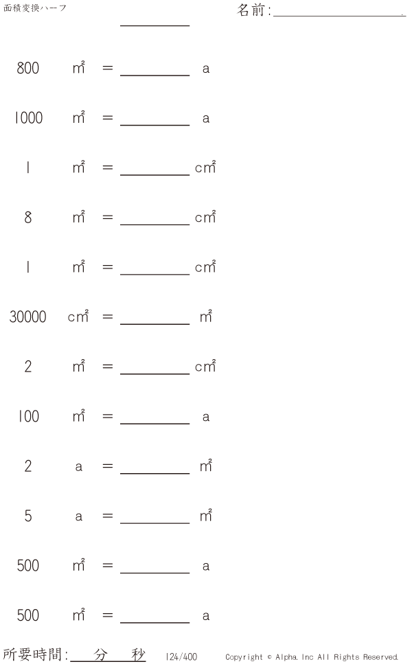 上記のボタンから「面積変換@12」の算数数学ドリル・計算ドリル(PDFプリント)がダウンロードできます。個人利用は無料です(家庭以外での配布は有料です)。