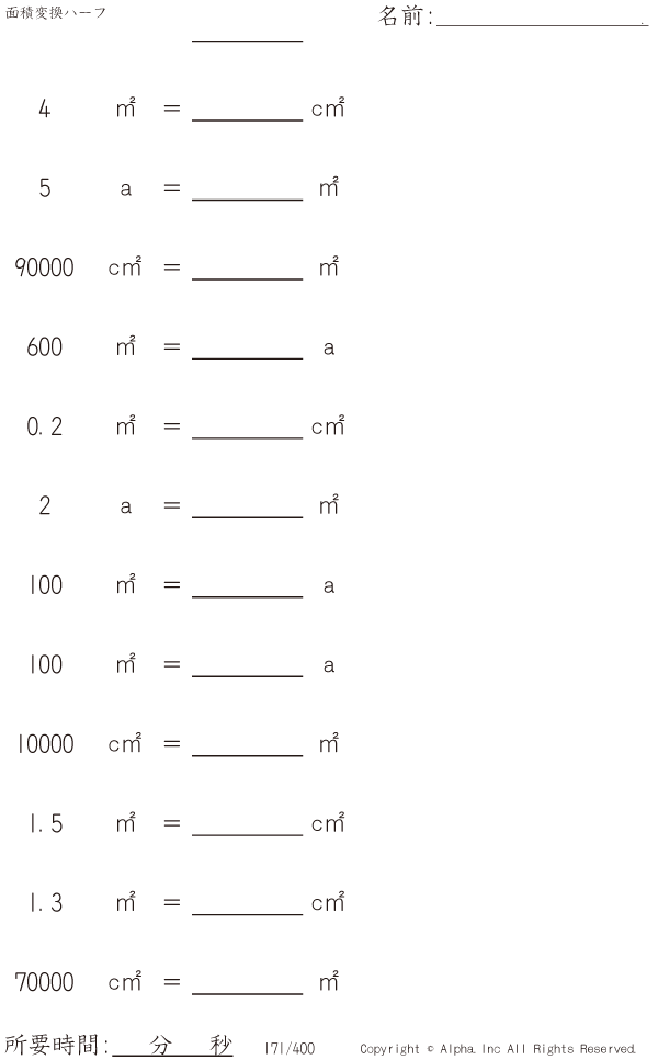 上記のボタンから「面積変換@12」の算数数学ドリル・計算ドリル(PDFプリント)がダウンロードできます。個人利用は無料です(家庭以外での配布は有料です)。