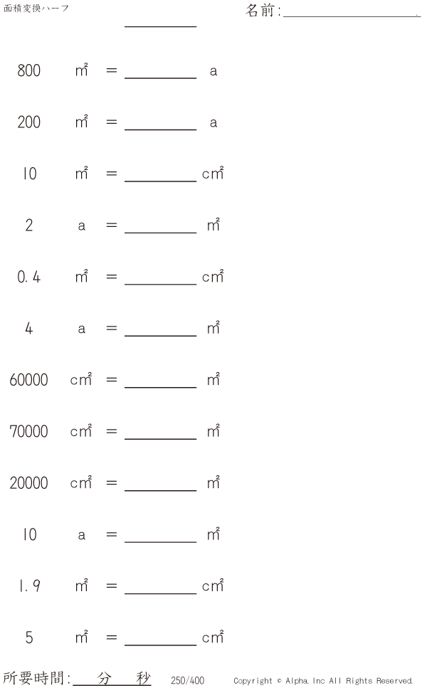 上記のボタンから「面積変換@12」の算数数学ドリル・計算ドリル(PDFプリント)がダウンロードできます。個人利用は無料です(家庭以外での配布は有料です)。