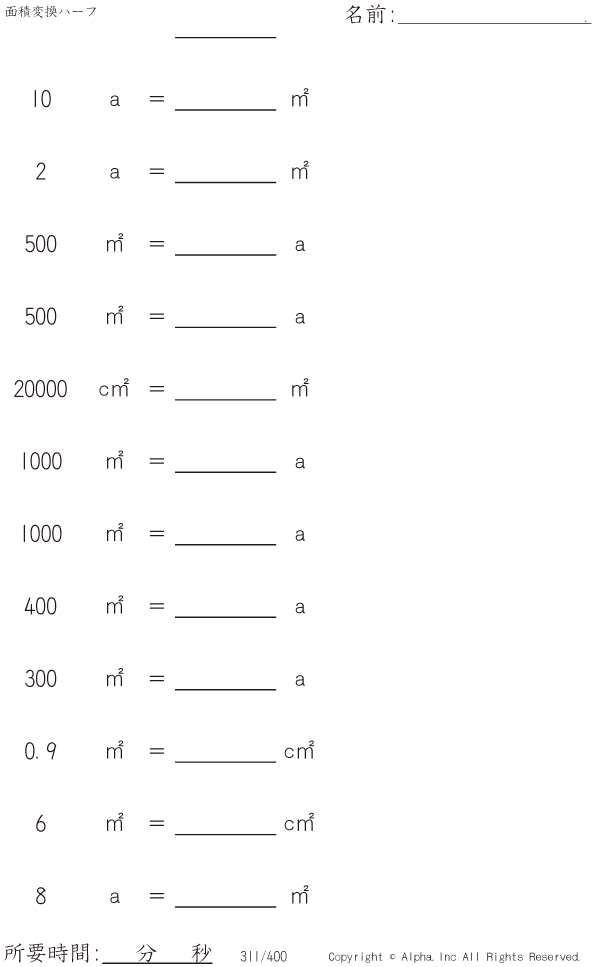 上記のボタンから「面積変換@12」の算数数学ドリル・計算ドリル(PDFプリント)がダウンロードできます。個人利用は無料です(家庭以外での配布は有料です)。