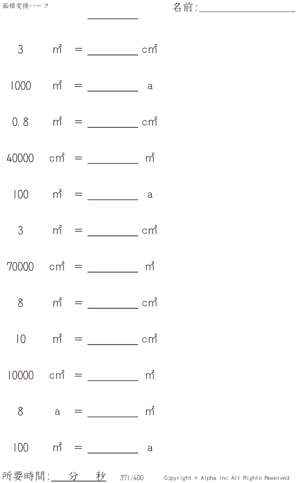 上記のボタンから「面積変換@12」の算数数学ドリル・計算ドリル(PDFプリント)がダウンロードできます。個人利用は無料です(家庭以外での配布は有料です)。