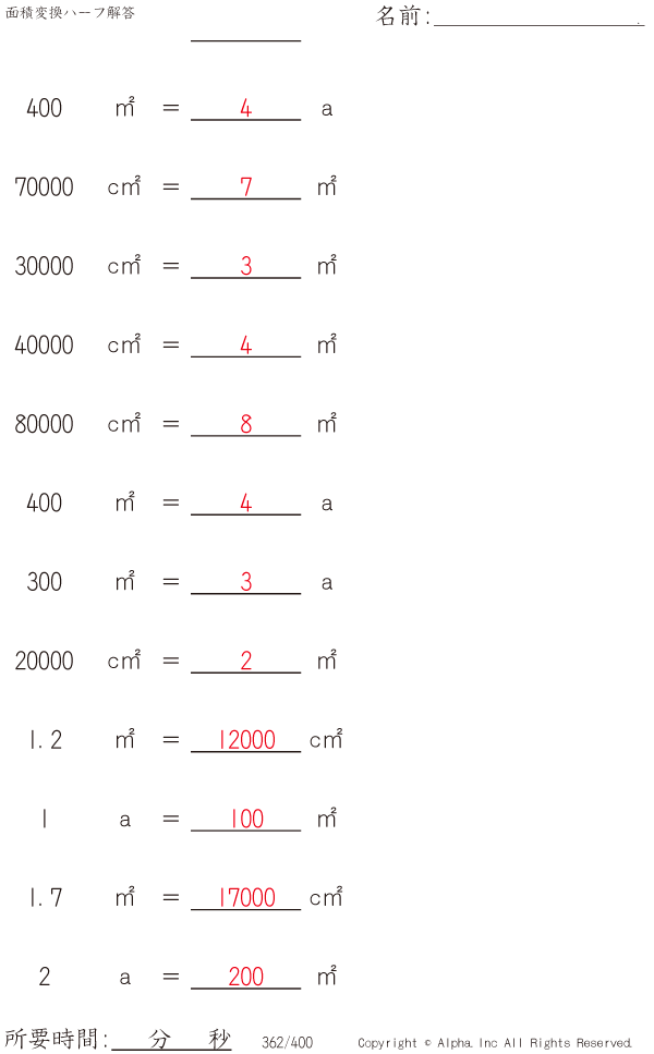 上記のボタンから「面積変換@12」の算数数学ドリル・計算ドリル(PDFプリント)がダウンロードできます。個人利用は無料です(家庭以外での配布は有料です)。