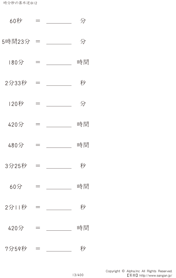 上記のボタンから「時分秒の基本逆@12」の算数数学ドリル・計算ドリル(PDFプリント)がダウンロードできます。個人利用は無料です(家庭以外での配布は有料です)。