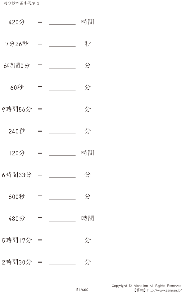 上記のボタンから「時分秒の基本逆@12」の算数数学ドリル・計算ドリル(PDFプリント)がダウンロードできます。個人利用は無料です(家庭以外での配布は有料です)。