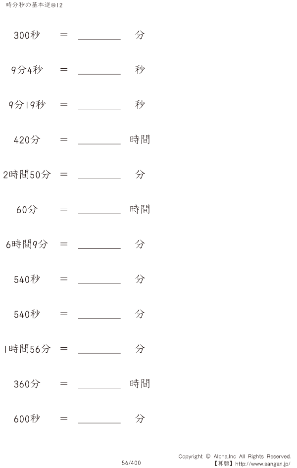 上記のボタンから「時分秒の基本逆@12」の算数数学ドリル・計算ドリル(PDFプリント)がダウンロードできます。個人利用は無料です(家庭以外での配布は有料です)。