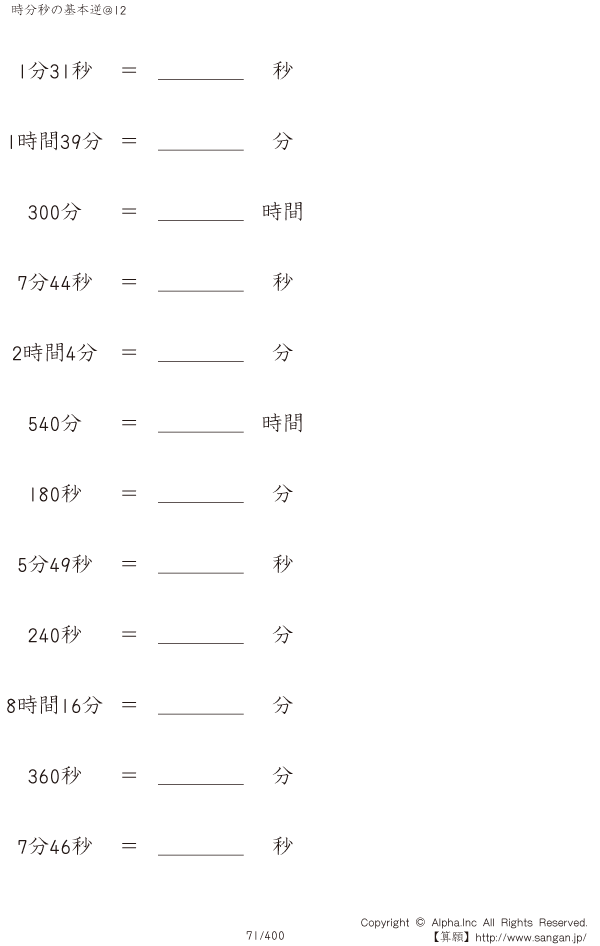 上記のボタンから「時分秒の基本逆@12」の算数数学ドリル・計算ドリル(PDFプリント)がダウンロードできます。個人利用は無料です(家庭以外での配布は有料です)。