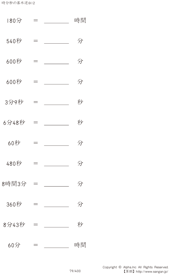 上記のボタンから「時分秒の基本逆@12」の算数数学ドリル・計算ドリル(PDFプリント)がダウンロードできます。個人利用は無料です(家庭以外での配布は有料です)。