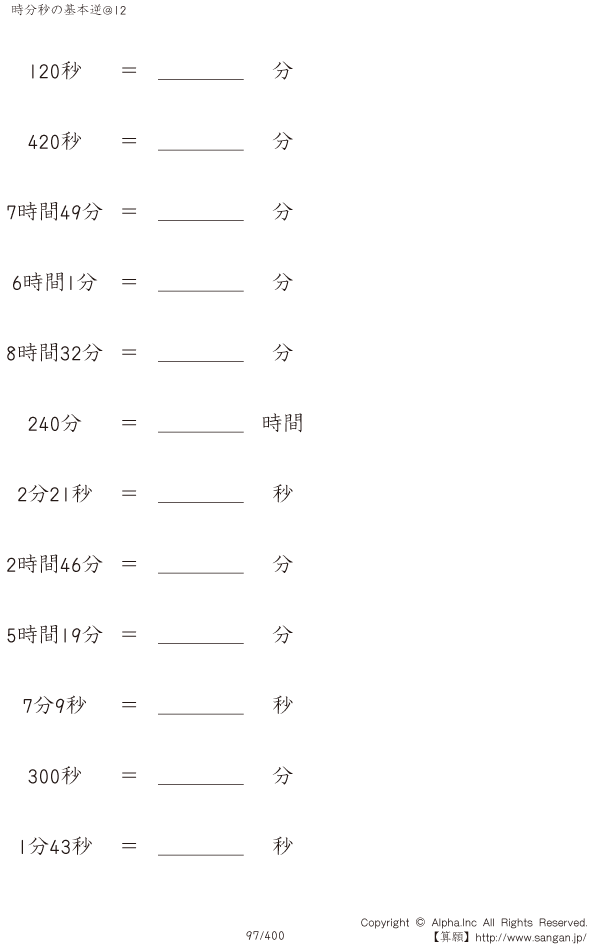 上記のボタンから「時分秒の基本逆@12」の算数数学ドリル・計算ドリル(PDFプリント)がダウンロードできます。個人利用は無料です(家庭以外での配布は有料です)。