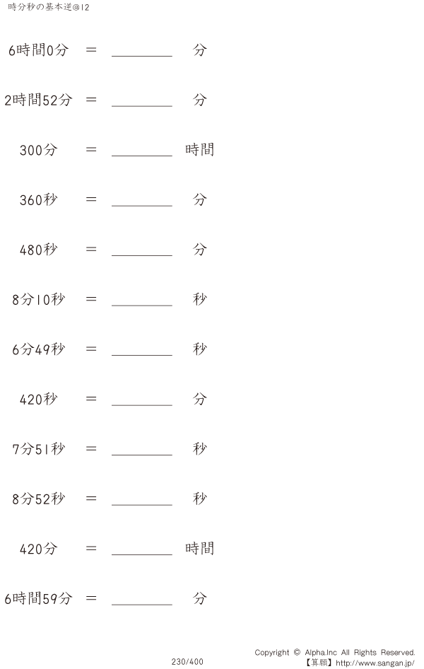 上記のボタンから「時分秒の基本逆@12」の算数数学ドリル・計算ドリル(PDFプリント)がダウンロードできます。個人利用は無料です(家庭以外での配布は有料です)。