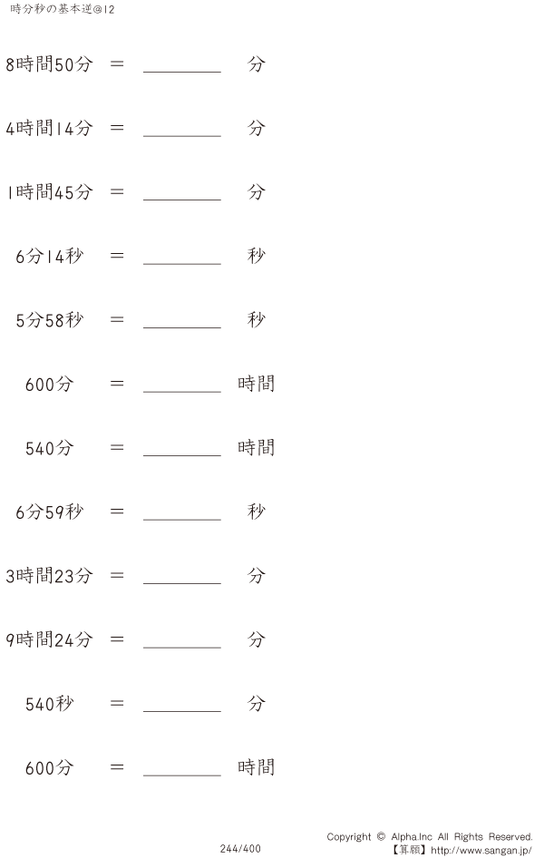 上記のボタンから「時分秒の基本逆@12」の算数数学ドリル・計算ドリル(PDFプリント)がダウンロードできます。個人利用は無料です(家庭以外での配布は有料です)。