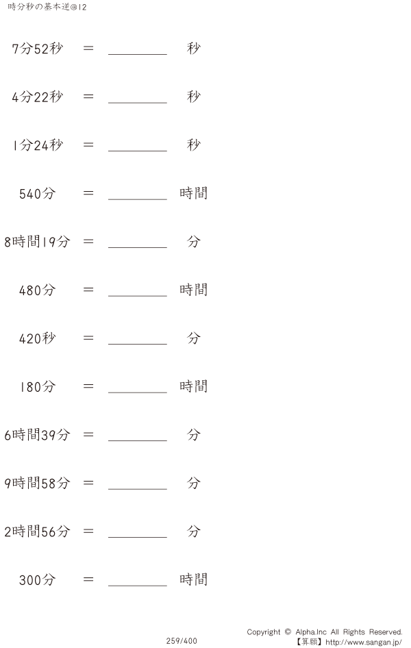 上記のボタンから「時分秒の基本逆@12」の算数数学ドリル・計算ドリル(PDFプリント)がダウンロードできます。個人利用は無料です(家庭以外での配布は有料です)。
