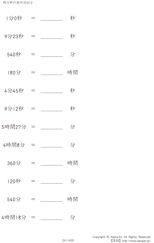 上記のボタンから「時分秒の基本逆@12」の算数数学ドリル・計算ドリル(PDFプリント)がダウンロードできます。個人利用は無料です(家庭以外での配布は有料です)。