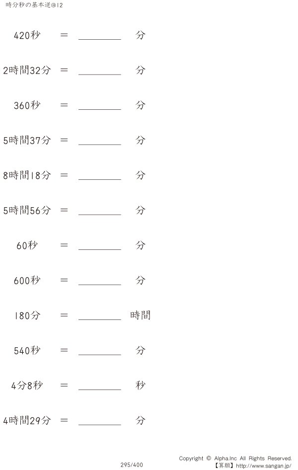 上記のボタンから「時分秒の基本逆@12」の算数数学ドリル・計算ドリル(PDFプリント)がダウンロードできます。個人利用は無料です(家庭以外での配布は有料です)。