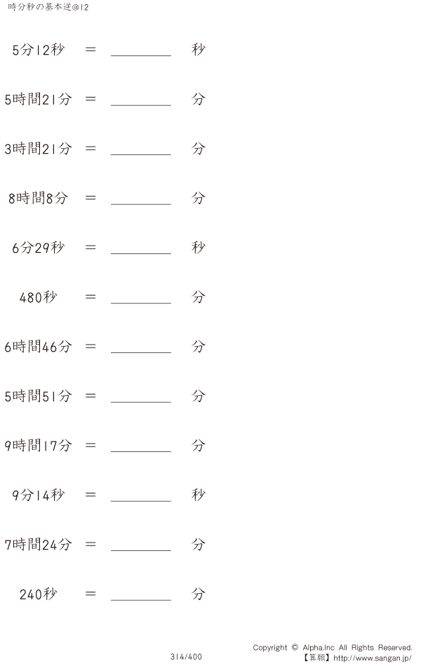 上記のボタンから「時分秒の基本逆@12」の算数数学ドリル・計算ドリル(PDFプリント)がダウンロードできます。個人利用は無料です(家庭以外での配布は有料です)。