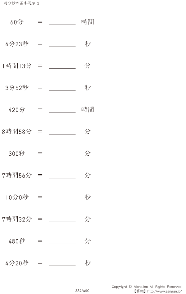上記のボタンから「時分秒の基本逆@12」の算数数学ドリル・計算ドリル(PDFプリント)がダウンロードできます。個人利用は無料です(家庭以外での配布は有料です)。