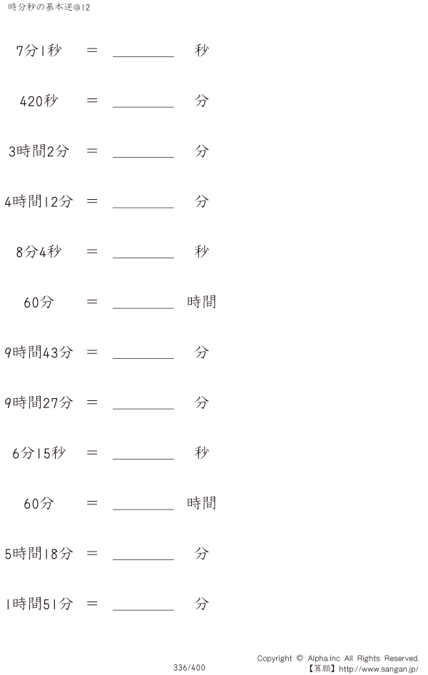 上記のボタンから「時分秒の基本逆@12」の算数数学ドリル・計算ドリル(PDFプリント)がダウンロードできます。個人利用は無料です(家庭以外での配布は有料です)。