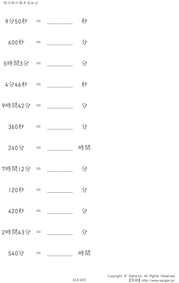 上記のボタンから「時分秒の基本逆@12」の算数数学ドリル・計算ドリル(PDFプリント)がダウンロードできます。個人利用は無料です(家庭以外での配布は有料です)。
