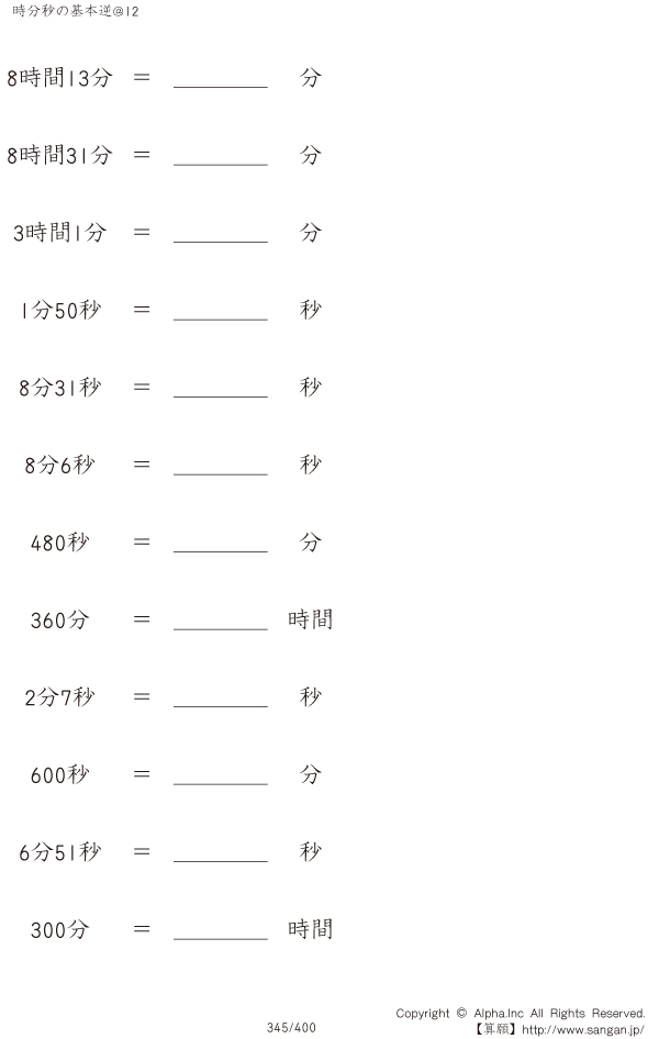 上記のボタンから「時分秒の基本逆@12」の算数数学ドリル・計算ドリル(PDFプリント)がダウンロードできます。個人利用は無料です(家庭以外での配布は有料です)。