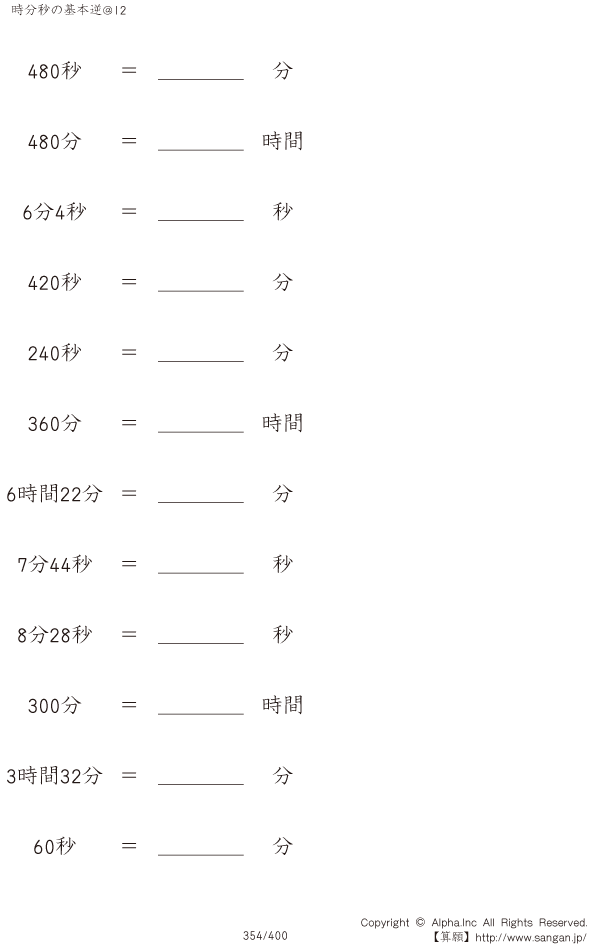 上記のボタンから「時分秒の基本逆@12」の算数数学ドリル・計算ドリル(PDFプリント)がダウンロードできます。個人利用は無料です(家庭以外での配布は有料です)。