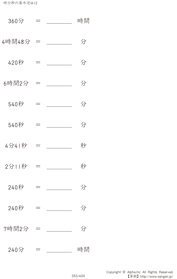 上記のボタンから「時分秒の基本逆@12」の算数数学ドリル・計算ドリル(PDFプリント)がダウンロードできます。個人利用は無料です(家庭以外での配布は有料です)。