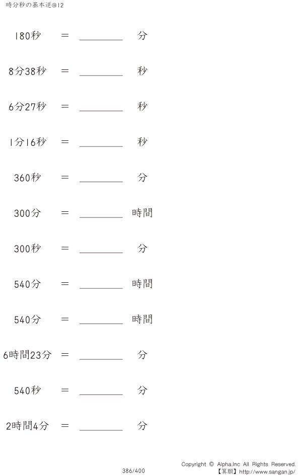 上記のボタンから「時分秒の基本逆@12」の算数数学ドリル・計算ドリル(PDFプリント)がダウンロードできます。個人利用は無料です(家庭以外での配布は有料です)。